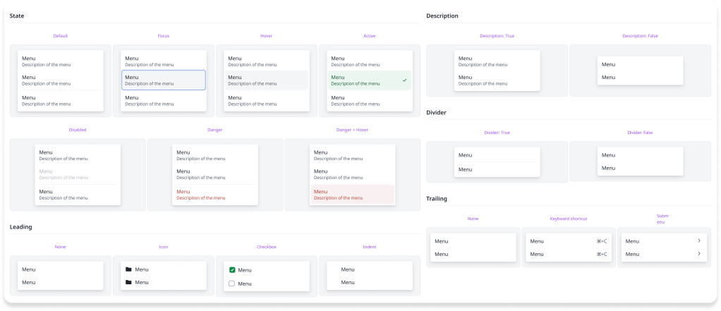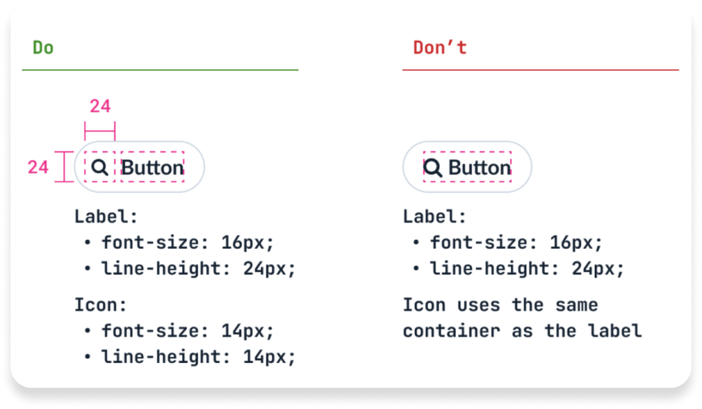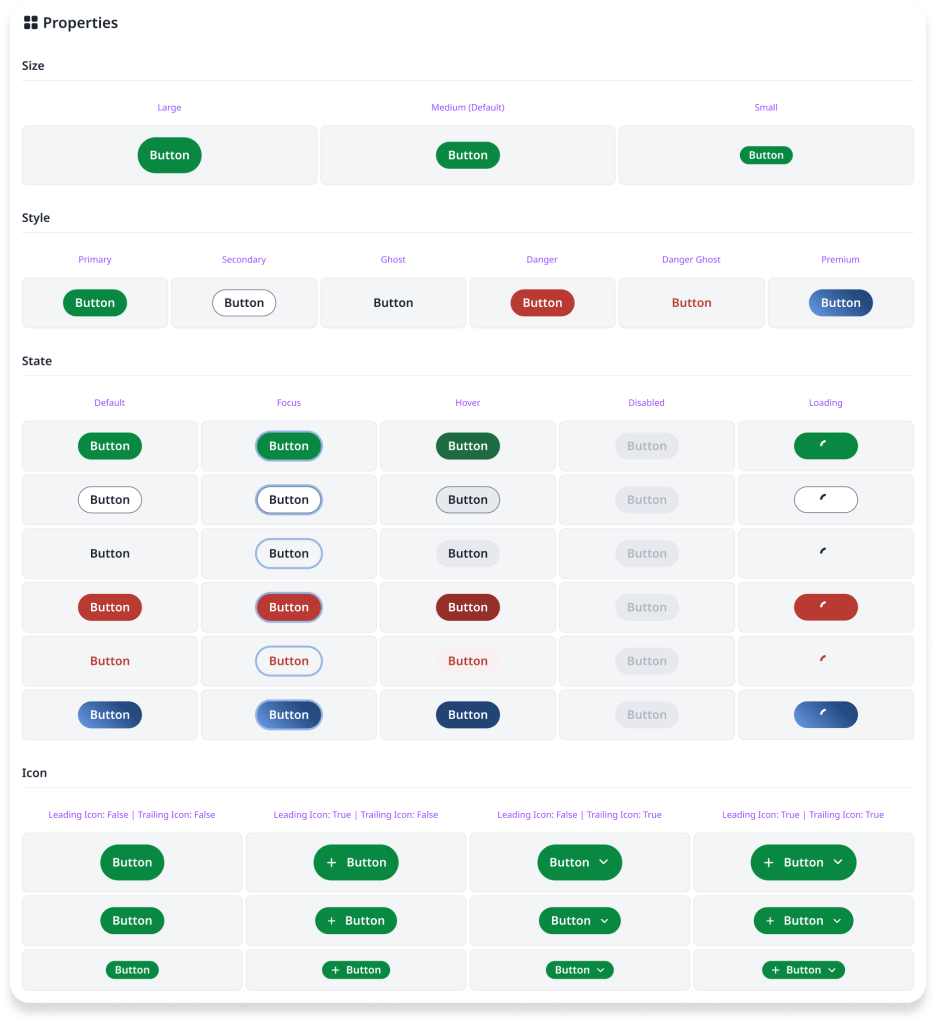 To foster a shared language, the components (e.g. button) and their properties (e.g. type: primary) use the same nomenclature, in Figma and in code.