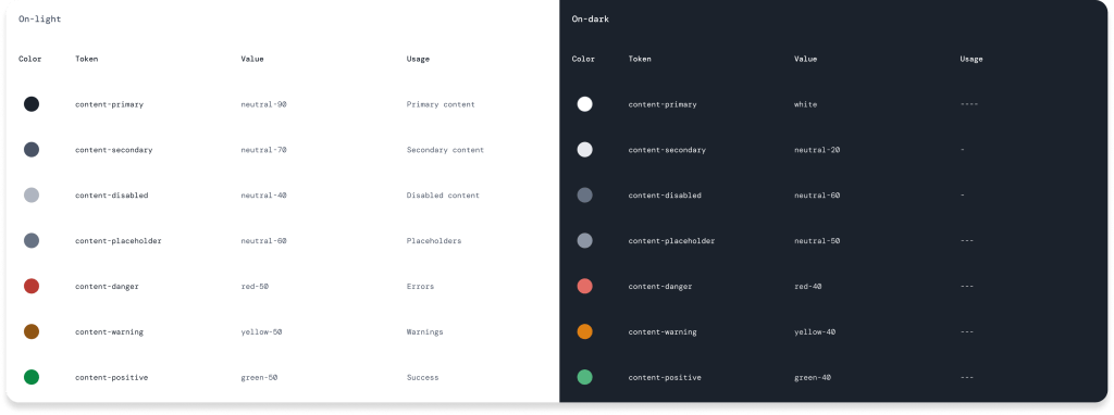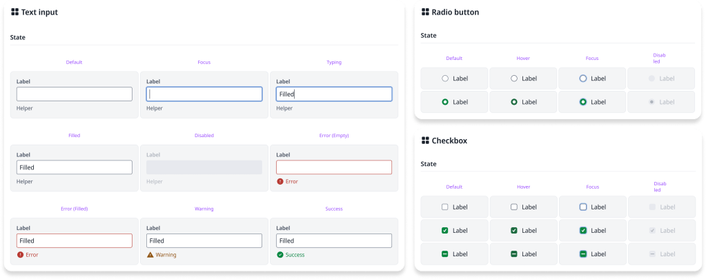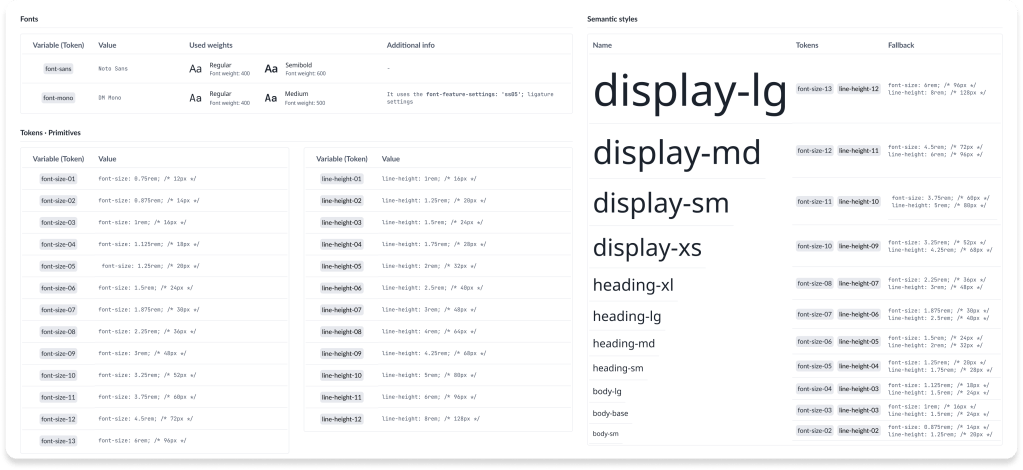 The baseline of the shared language, these are the foundational and reusable design attributes (design tokens), implemented as variables, both in Figma and in code. Including: