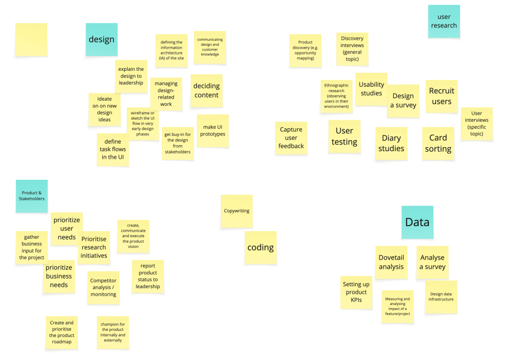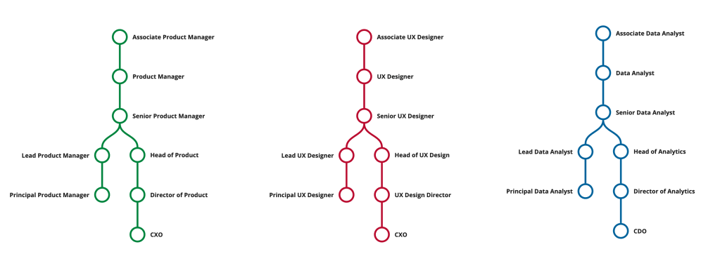 The second one was thinking about the commonalities between the three functions (product management, UX, analytics). We weren’t entirely sure whether we’d end up with a common career ladder for the entire product function, a common trunk of competencies, or just some shared elements. We were sure, however, that we wanted the ladder to reflect the blurred boundaries and interdisciplinary nature of our jobs.