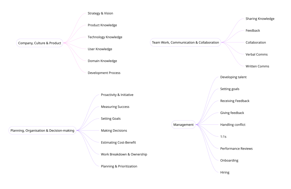 The first one was the notion that we wanted a tool to guide and foster growth conversations, not a checklist. We didn’t want something to say “nope; you haven’t ticked this one, so you can’t progress any further”; we wanted something that invites discussion and provides direction.