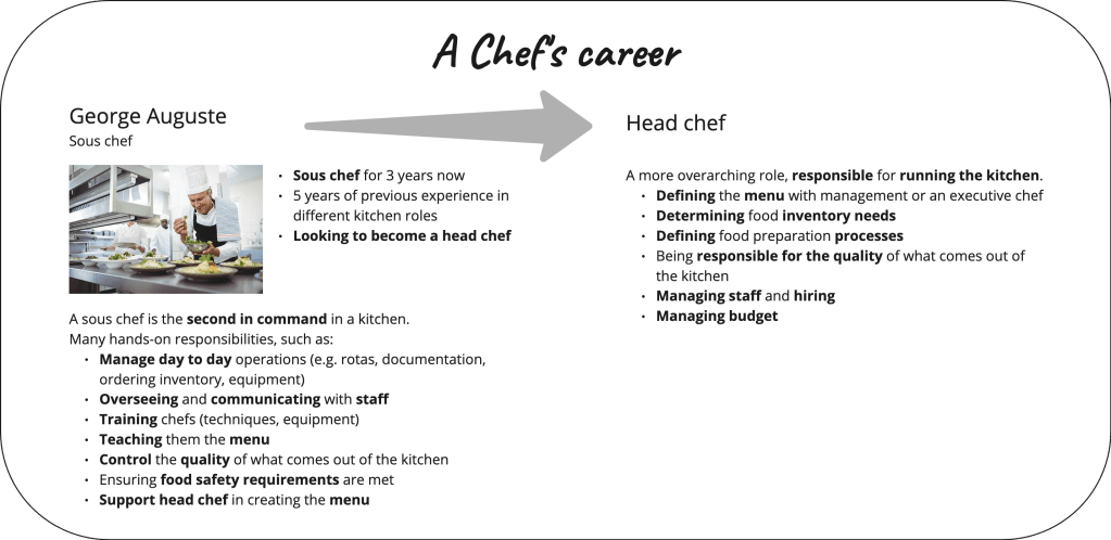 The first workshop we ran was a values workshop. We wanted to understand what fair looks like to our teams. For this, we’ve created a scenario detached from our daily realities: George Auguste, a sous chef wanting to become a head chef. We then workshopped with the team around two main questions: