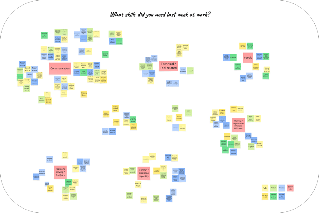 The second workshop was a competencies workshop. We essentially asked the team first to brainstorm any competencies they needed (or even just activities they had done), and then worked on clustering them, discussing, etc.