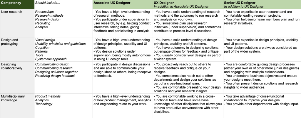 Equipped with levels and competencies, the next challenge was to describe what the expectations were for each competency, at each level. For instance, what do we expect from a Senior UX designer when it comes to Design and Prototyping?
