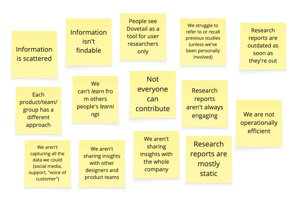 To form a better picture of the current state of affairs, I needed to understand how research was being conducted by different designers and product managers, how the insights were disseminated and, ultimately, how impactful the research practice was. I have conducted interviews with people doing research as well as with stakeholders who might benefit from research (e.g. product leadership who’d benefit from user research insights when planning) and clustered their main pain points.