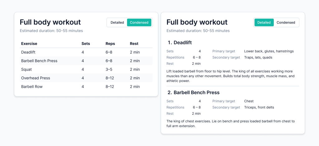 After configuring their choices, users can generate their workout. I’ve opted to provide two toggleable layout options: one with a lot of detail (e.g., on exercise technique) and another that is much more concise.