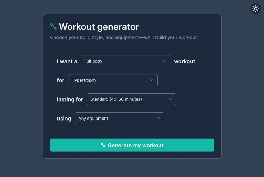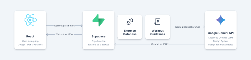 Why LLM-powered? I could generate random workouts from an exercise database, but exercise selection, ordering, volume, and rest periods are chosen intentionally when planning effective workouts. An LLM can analyse exercise science literature, distil it into guidelines, and then generate workouts following those principles.