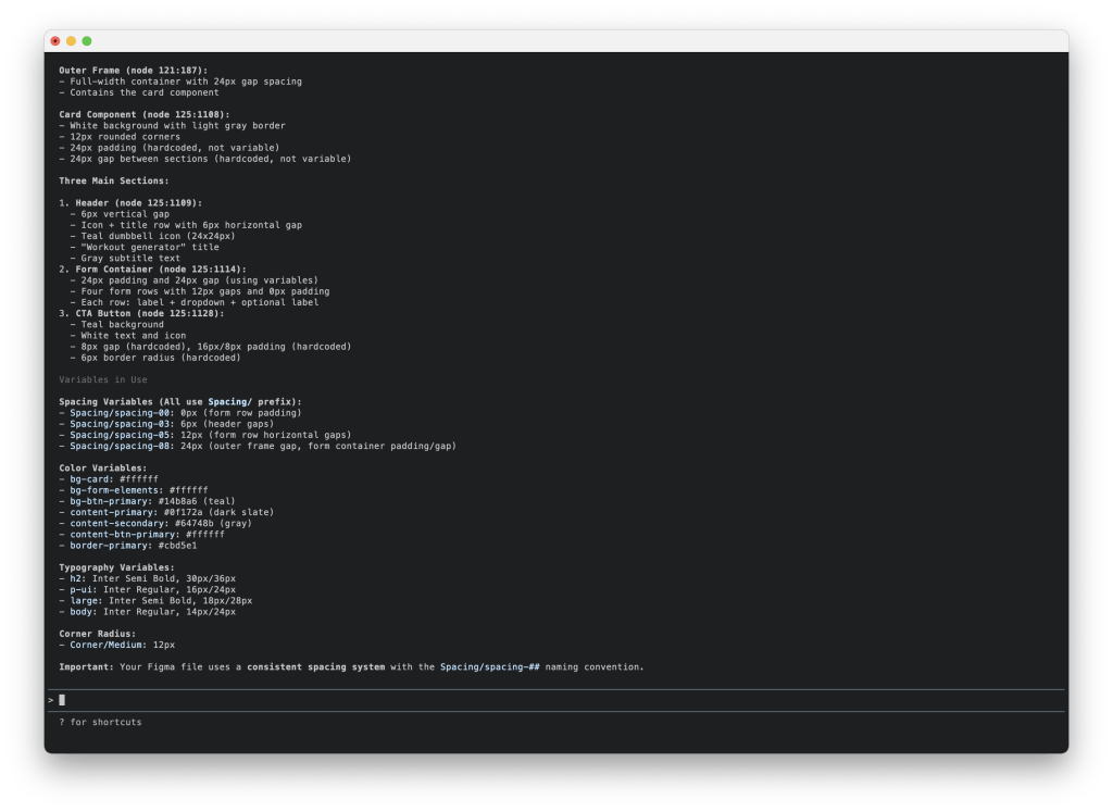 After bootstrapping, I had the moment that validated the entire workflow: I asked Claude Code to analyse my Figma file and extract its variables. The Figma MCP server was already running, and everything just… worked. Claude Code accurately described the UI, the variables in use, the components — all the design context was passed through automatically. No specs, no manual translation.