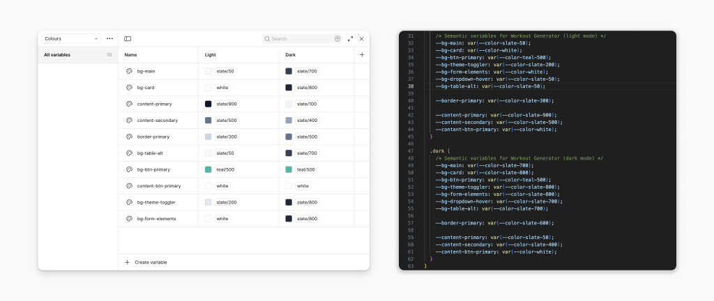 I’ve used a very simple palette, with teal as the accent colour. All of these choices were codified as Figma variables/design tokens, themselves pointing to Tailwind variables. This made it trivial to implement a dark mode as well (using Figma’s variable modes feature).