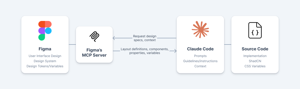 MCP is an open protocol/standard that allows AI tools (like Claude Code) to connect to and read from external sources (in this case, Figma files). With Figma’s MCP server running, Claude Code can read the design file directly, eliminating the need for manual handover and specifying design details in prompts. A developer doesn’t need to open Figma to check spacing values or find the correct component variant. The designer doesn’t need to write specs documenting which colours or tokens to use. The context is already there, accessible when needed.